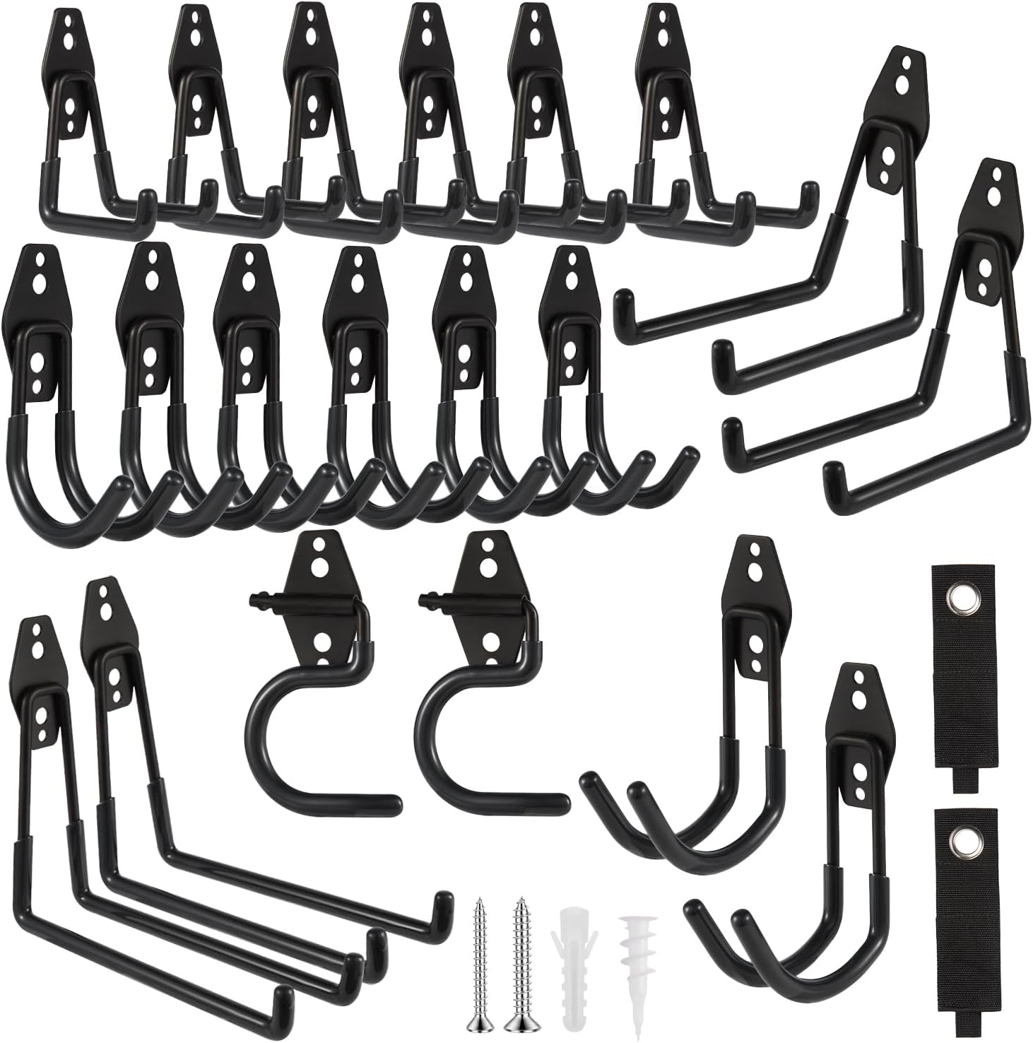 - ZexHok Wall Hook Assortment Set: 22 pack storage hooks organizer include with 6 sizes: 6pcs small J hooks, 6pcs small U hooks, 2pcs large J hooks, 2pcs middle U hooks, 2pcs large U hooks, 2pcs S hooks and 2pcs straps for hanging tools of different sizes and weight.