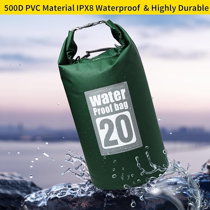 - Ultimate Waterproof Protection: Our Waterproof Dry Bag features an impressive IPX8 waterproof rating, ensuring your belongings stay dry in any wet situation. Crafted from durable 500D PVC material, it's designed to withstand the toughest outdoor conditions. Whether you're hiking, kayaking, or camping, this bag is your reliable companion.