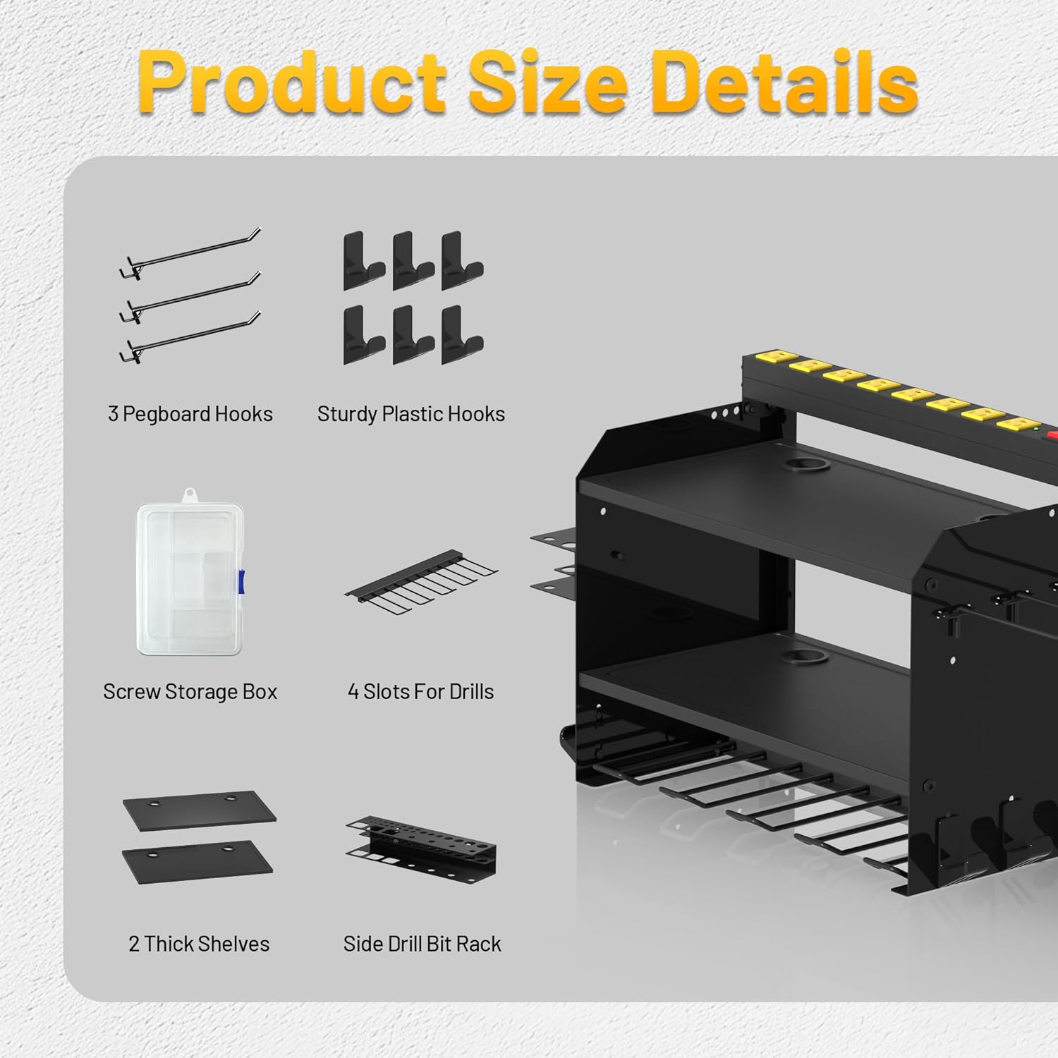 - TOOL CHARGING STATION:8 outlets power strip for power tool organizer solves the power needs,with 125V/15A/1875W,6ft power cord and 2100J surge protection to protect power equipment;Drill holes in single-layer boards to solve power cord clutter problems