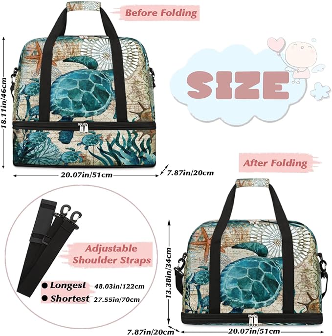 Turtle Foldable Travel Duffel Bag, Expandable Sports Gym Bag with Shoes Compartment Weekender Overnight Totes Bags for Women Men