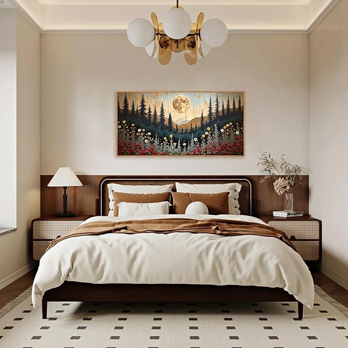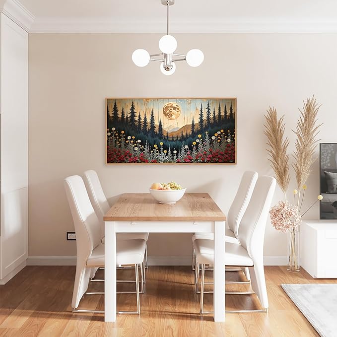 - 【Vintage Moon Forest Wall Art Set】This vintage moon forest framed canvas wall art set executed in a charming nature style, captures full moon,mountain, trees and wildflowers, evoking an poetic atmosphere. Its modern aesthetic is reminiscent of nature charm. Utilizing this artwork as part of your decor will make your room full of poetry.