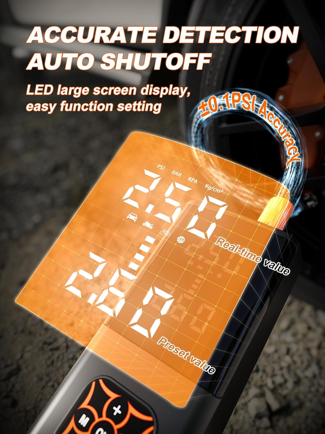 - 【4+N Smart Modes】Suitable for bicycles, motorcycles, cars, and sports balls. Automatically shuts off when the preset pressure is reached. No need to worry about over-inflating your tires. Easily switch between PSI, kPa, BAR, and KG/CM² pressure units with a single button.