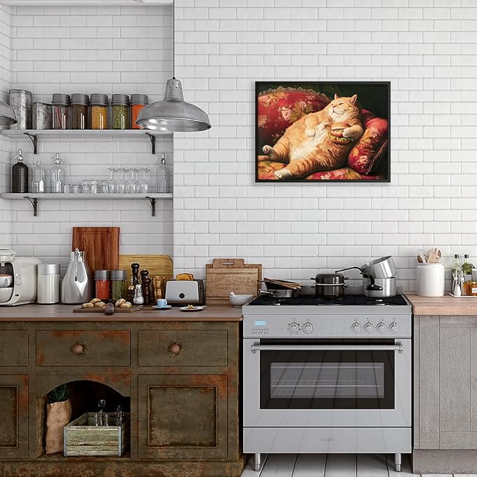 Victorian Renaissance Canvas Poster Funny Fat Cat With Hamburger Wall Art Lying In Sofa Cute Cat Painting Wall Decor 24x36 inch Black Framed for Animal Lover Gift