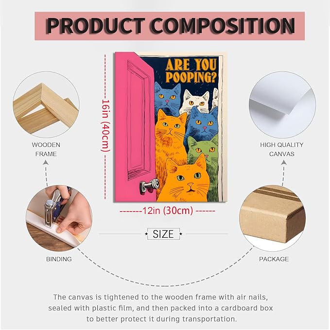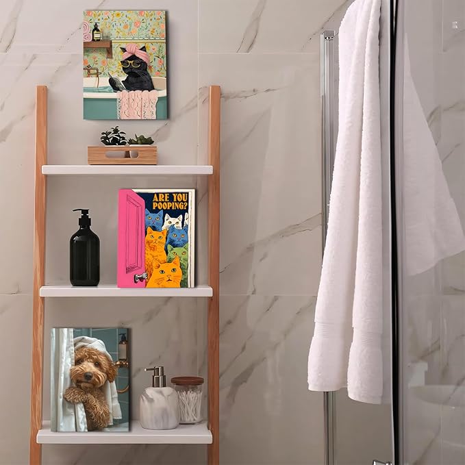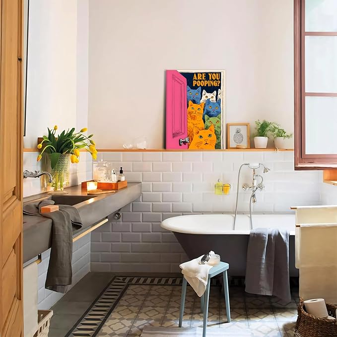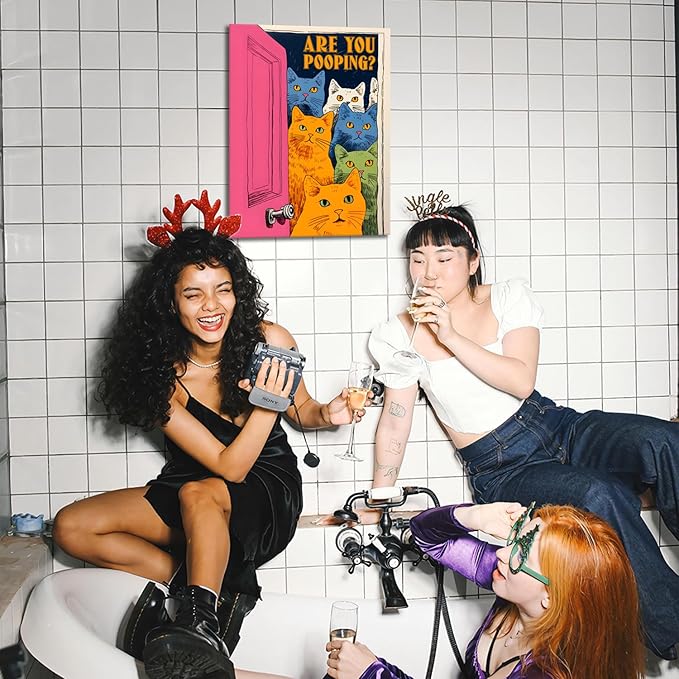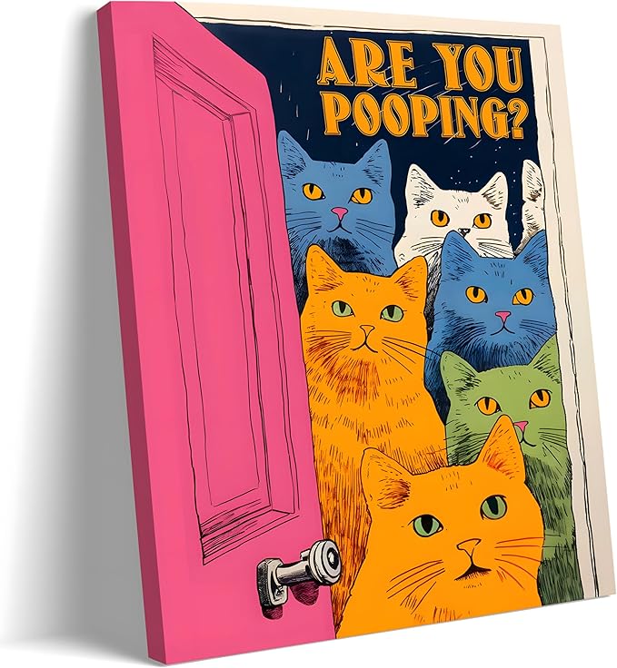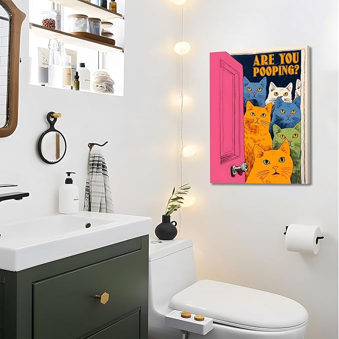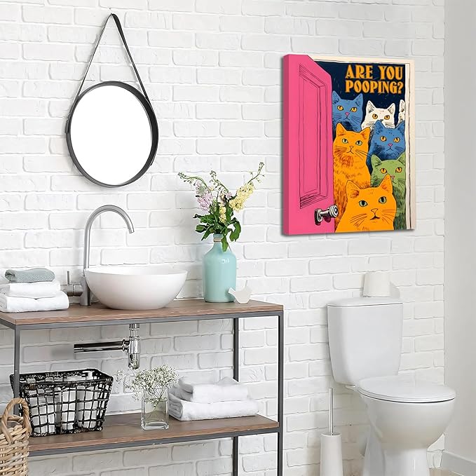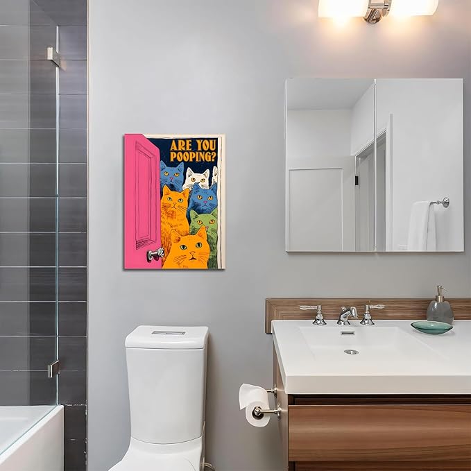 - Funny Cat Bathroom Wall Art : This Funny Bathroom Cat Canvas Wall Art features a playful cat print with the cheeky phrase "Are You Pooping?" Perfect for adding humor and personality to your bathroom, toilet, or kids' room. Bring a smile to your face every time you enter!