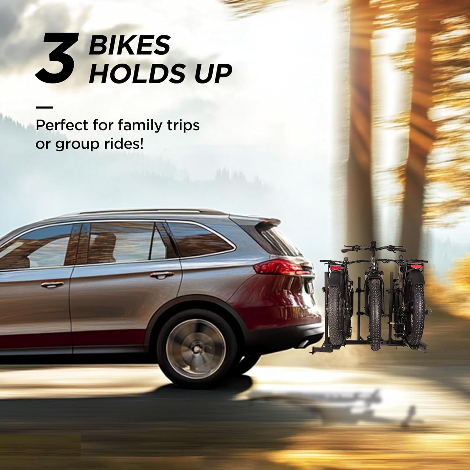 Rockland Foldable 3-Ebike Rack with Ramp, 250 lbs Capacity, Hitch Mount Electric Bike Rack, Fits up to 5" Fat Tire Width and 50" Wheelbase, Ebike Carrier Rack for 2" Receiver for Cars SUVs Vans RVs