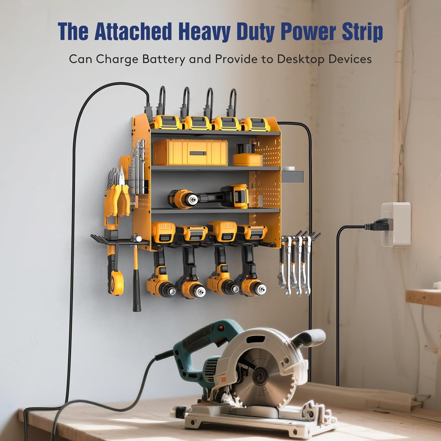 - 【4-Layers Wall Mount Tools Organizer】Power tools organizer comes with 4 drills, 2 hooks, screw & screwdriver organizer, built-in metal power strip. The 4-layer rack can accommodate more tools, and the wall mount design ensures tools storage in the work area and saves your bench space.