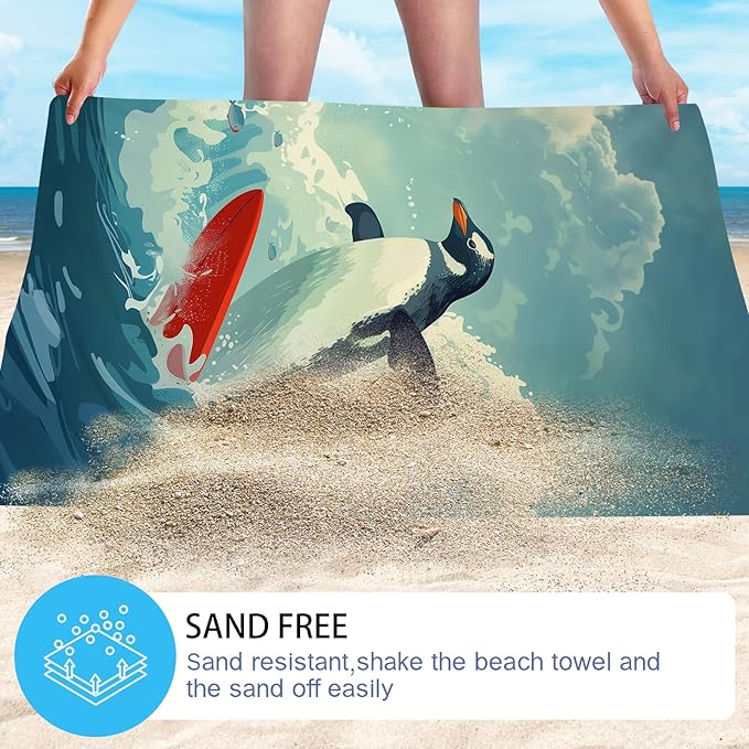 WZOMT Microfiber Penguin Beach Towel Oversized, Cute Penguin Surfing Ocean Animal Blue Bath Towels for Adults Kids, Soft Quick Dry Absorbent Sandproof Travel Swim Pool Towels 32x52 Inch