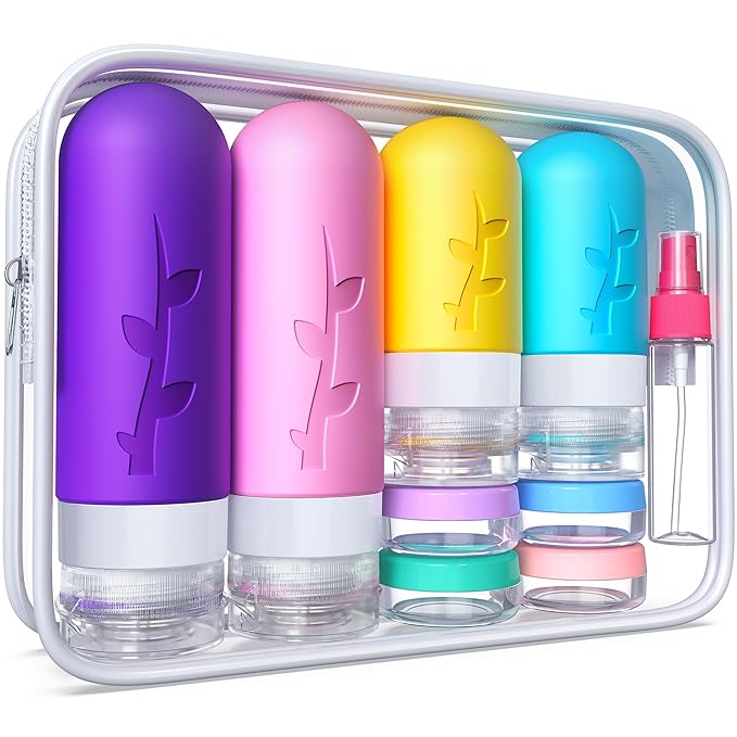 - 【18 pack travel Essentials 】Our 18 pack reusable travel bottles set with 1 waterproof bag, 2 pcs Leak poof silicone bottles (3 oz/90 ml), 2 pcs silicone bottles(2 oz/60 ml), 2 pcs spray bottles(1.05 oz/30 ml), 4 pcs cream jars(0.35 oz/10 ml), 1pcs funnels, labels, brush and 4 pcs spatula, different accessories for your different needs