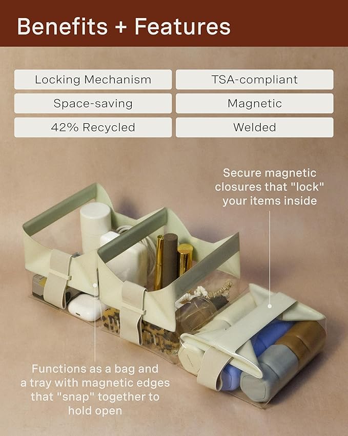 - INNOVATIVE MAGNETIC CLOSURE: This magnetic toiletry bag features a one-of-a-kind closure system that’s quick, secure, and omnidirectional. Open it wide for easy access or lock it for added security, all without snaps, zips, or buttons.