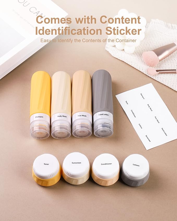 - Travel Size Toiletries: Set includes 4 silicone squeeze bottles 3oz(90ml) and 4 silicone cream jars 1oz(30ml) and clear make-up bag 6.46x2.87x5.31inch. Contents identification label sticker included