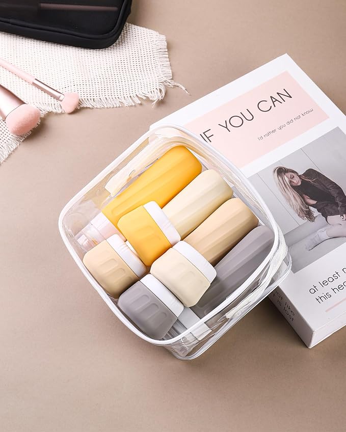 Travel Bottles for Toiletries 8 Pack, Travel Size Toiletries, Tsa Approved Travel Size Containers 3oz, with Travel Essentials Clear Bag, Leak Proof Silicone Squeezable Creams Jars