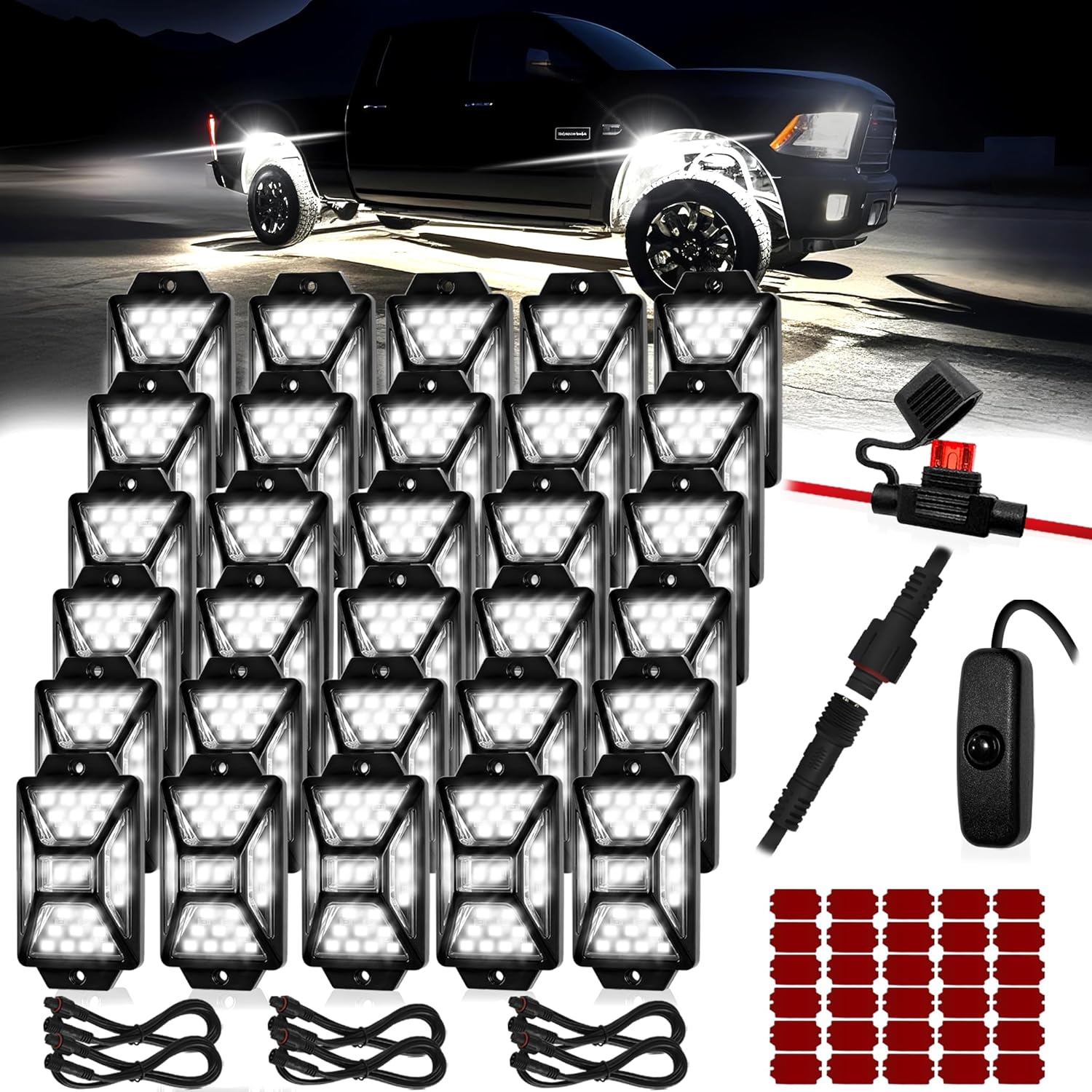 30 Pods Pure White LED Rock Lights Kit with Switch Wiring Harness,6500K 810 LEDs Bright Rock Lights for Trucks,Waterproof Underglow Light for Car Jeep Off Road ATV UTV SUV