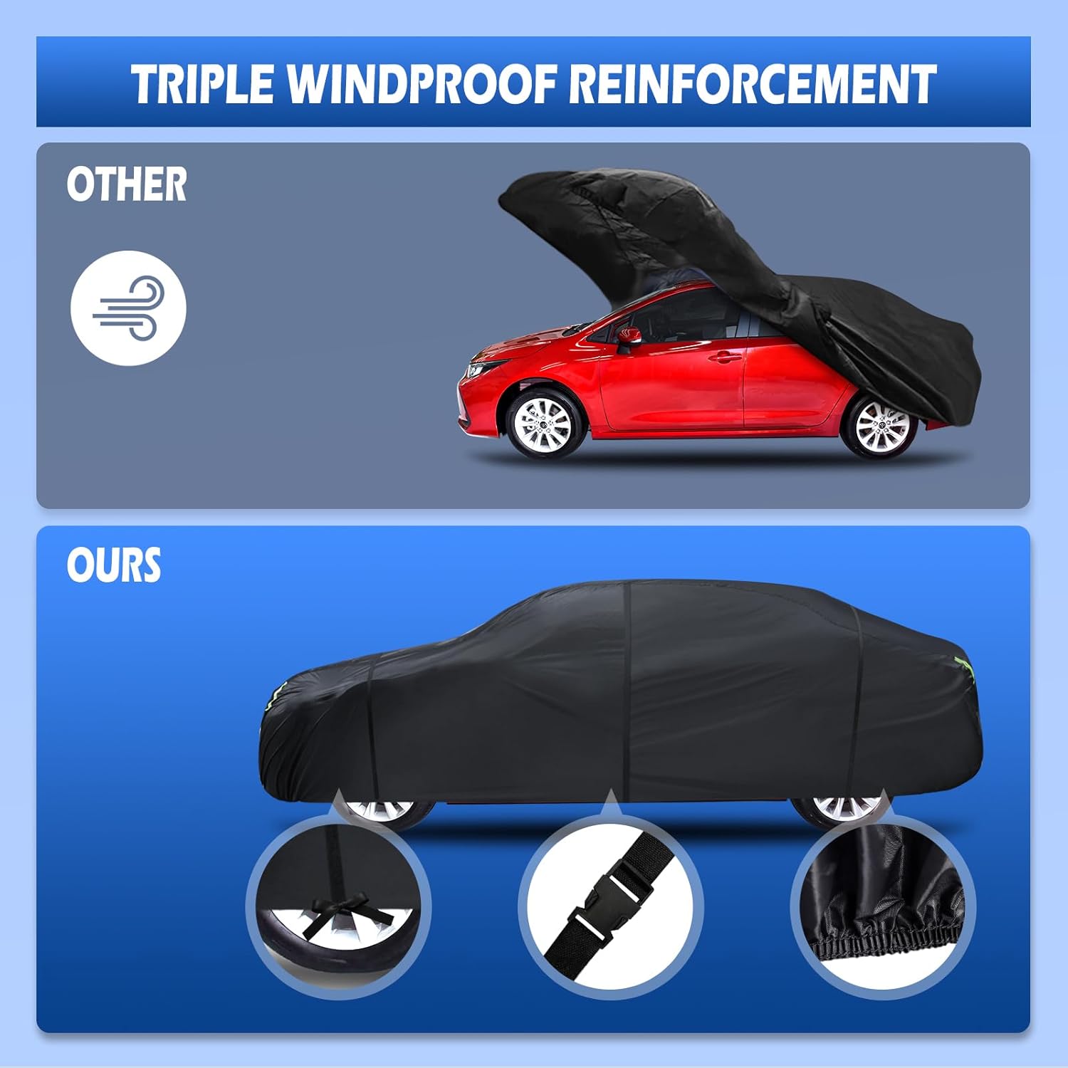 - 【Wind-Resistant Design】The car cover waterproof all weather has been specially designed to resist strong winds. ① Equipped with two bungee cords, which only take a few seconds to tie to the tires on both sides, it securely covers the front and rear of the car. ② There are specially designed windproof straps at the bottom to pass through the car's middle to ensure that the cover is not blown away. ③ The adjustable elastic hem makes it easy to adjust the size and fix the cover to the car body.