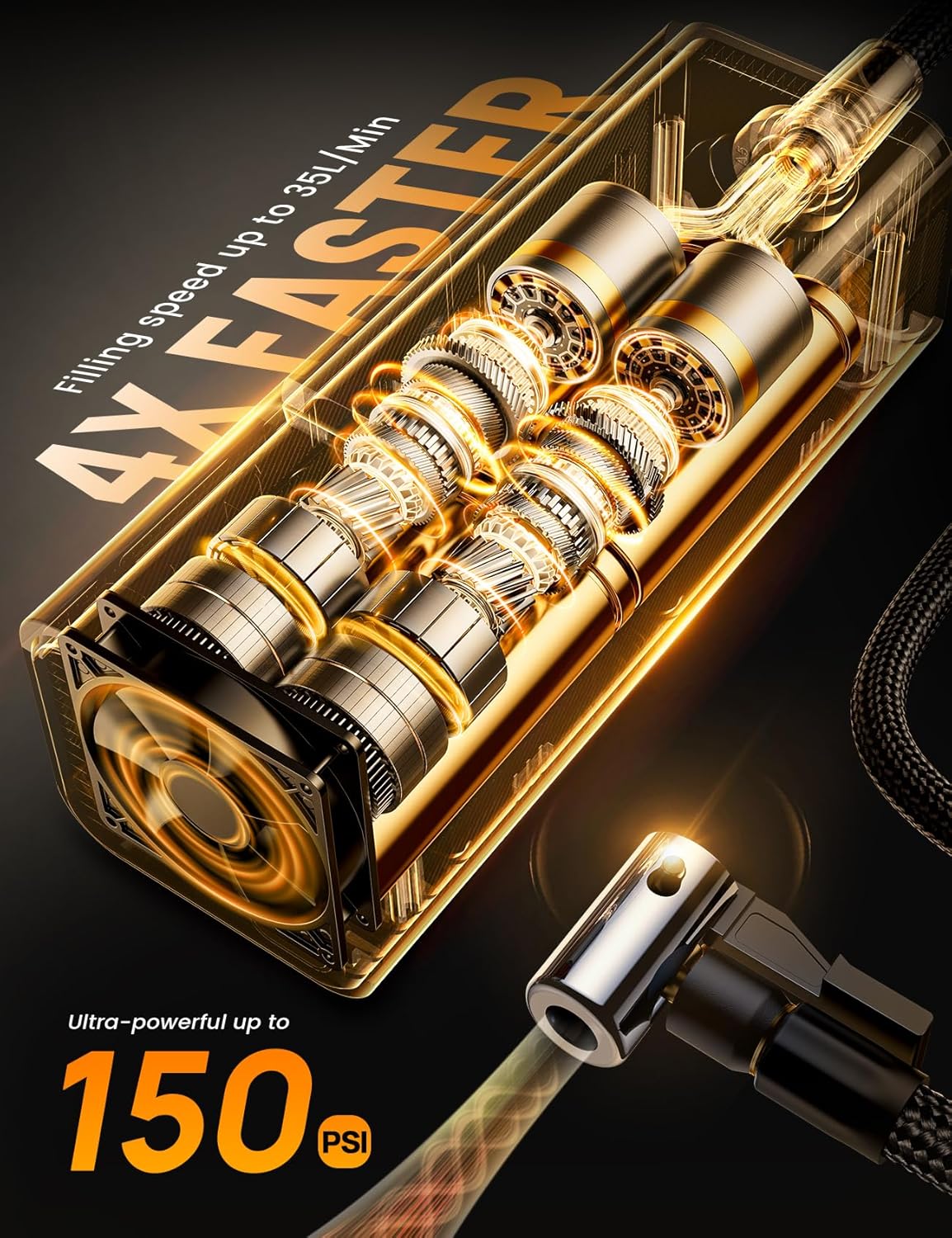 - 【4X Faster & Powerful】 The maximum pressure of this inflator can reach 150PSI, up to 35L/Min inflation airflow rate, 4 times faster than the ordinary inflator inflation speed, can be 195/65 R15 tires in 1 minute from 28 to 36PSI. This is a must-have accessory for car, motorcycles and bike.