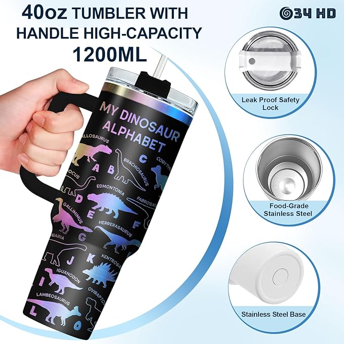 34HD 40oz Glitter Dinosaur Tumbler with Handle and Straw, 40oz Vacuum Insulated Dinosaur Alphabet Coffee Mug, Animal Lover Gifts for Kids Boys Girls Women Mothers Day