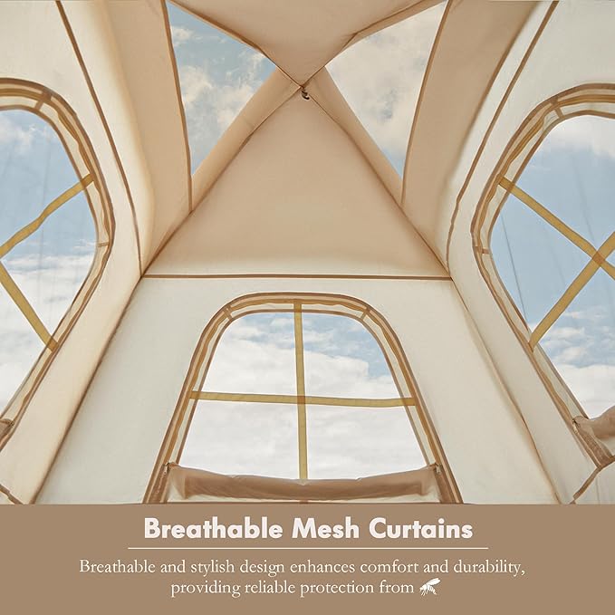 - 【Excellent Ventilation】This inflatable camping tent has mesh vents on the top and a removable top cloth. Whether it is raining or sunny, the inside of the tent can be well ventilated. The design of three-sided mesh and one door increases air circulation while protecting privacy, keeping you cool and comfortable on hot summer days