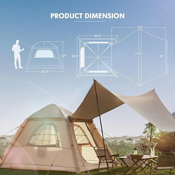 - 【Extended Canopy】 The 7.5 x 7.5 x 5.65 ft portable luxury camping tent can accommodate 2-4 people. What's more, the extended canopy of this tent is very large, providing a larger shade space. PS: The canopy can be removed and used alone