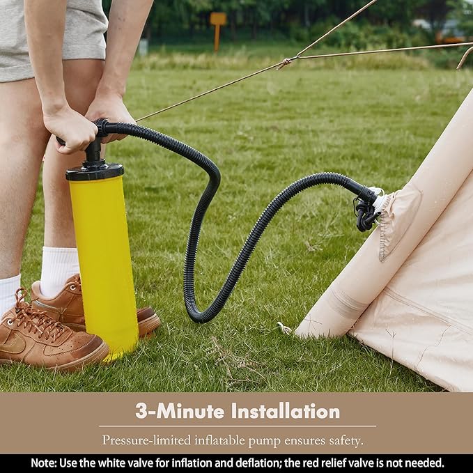 - 🏕️【SET UP IN ONE STEP】This portable inflatable tent features a one-piece inflatable pole design with high-temperature heat-sealed seams. It includes a manual pump that inflates quickly with a pressure-limiting valve for safety. The guylines and steel stakes help secure the 4-season tent to the ground. Set up is fast and easy, making your camping experience more relaxing.
