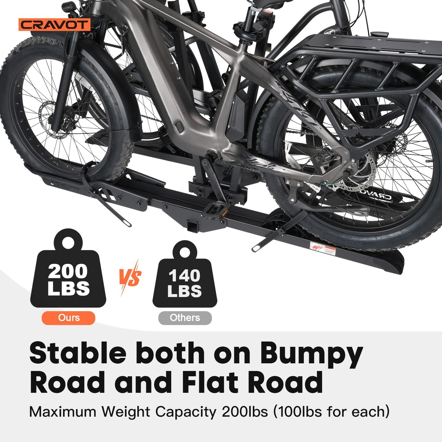 - 200lbs Capacity: CRAVOT ebike rack with a ramp, is possible to hold up to 200lbs in total, or 100lbs per ebike or heavy bike. Fitting any vehicle equipped with a 2-inch receiver and accommodating ebikes up to 5'' wide and with a wheelbase up to 50''.