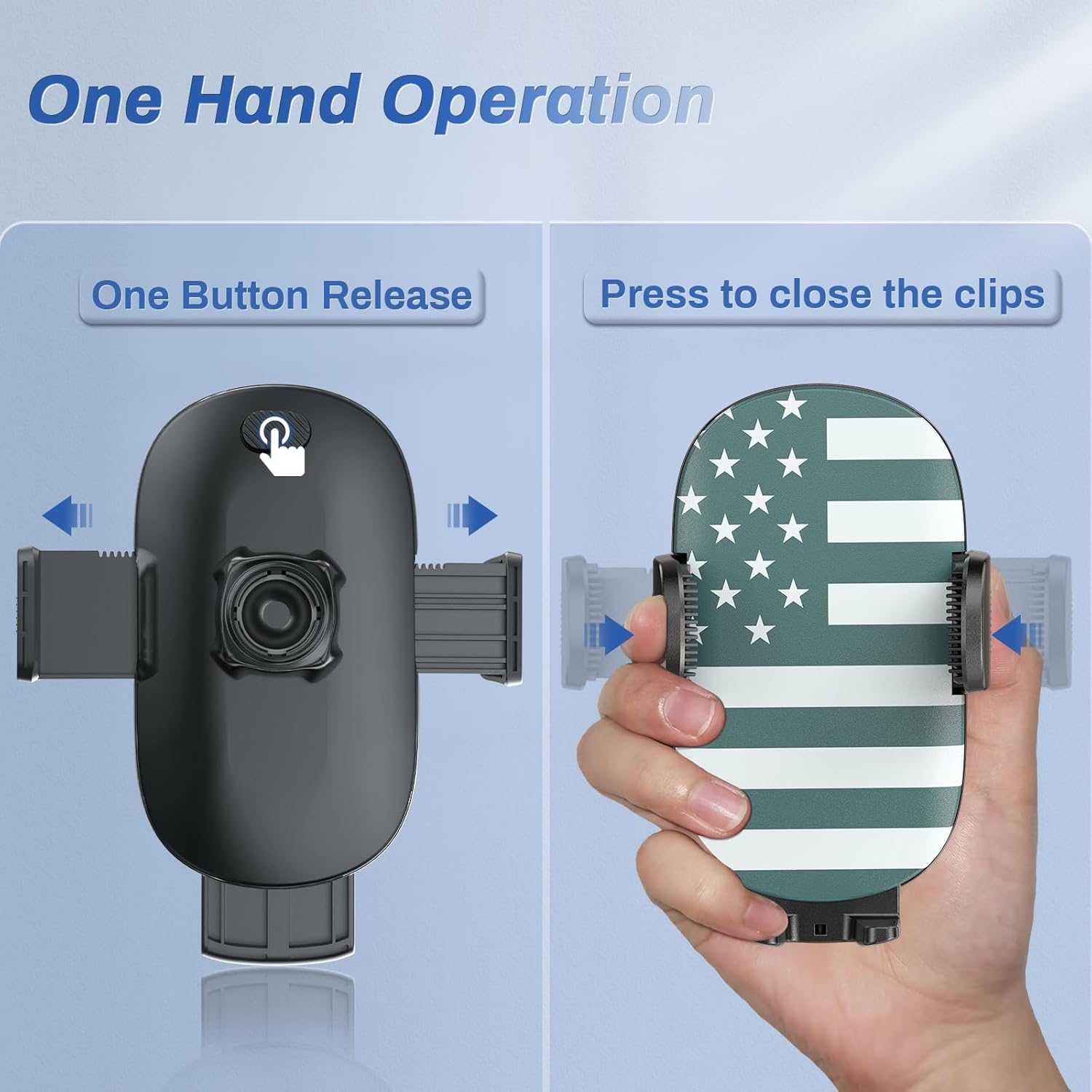 - Quick One-Button Release: Effortlessly mount and remove your phone with the one-button release system. Simply press the release button on the back of the cradle, and the clamp arms will smoothly slide open.