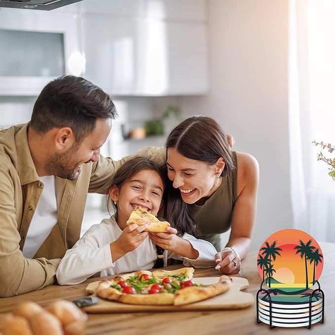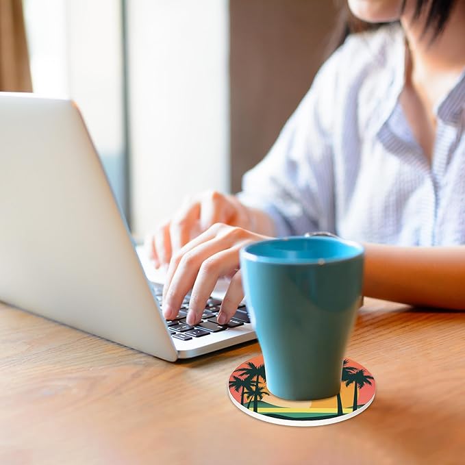 6 Pcs Drink Coasters with Holder,Palm Trees Beach Sunset Absorbent Round Ceramic Coaster for Tabletop Protection,for Coffee Cup Beverage Coasters Wine Beer Bar