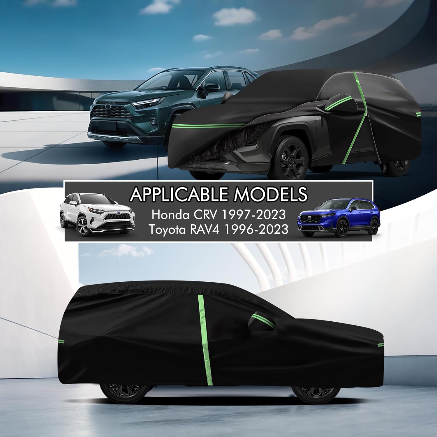 - 🚘【Premium Material】The car cover for Honda CRV 1997-2025, Toyota RAV4 1996-2025 is made of heavy-duty 210D Oxford cloth and waterproof silver-plated fabric, and has multi-layer cotton coating, which can be windproof, dustproof, UV-proof, sun-proof, not easy to tear, and withstand water pressure up to 1600mm. The inner layer also has a thickened cotton backing, which not only fully prevents the paint from being scratched, but also has thermal insulation, which is warm in winter and cool in summer.