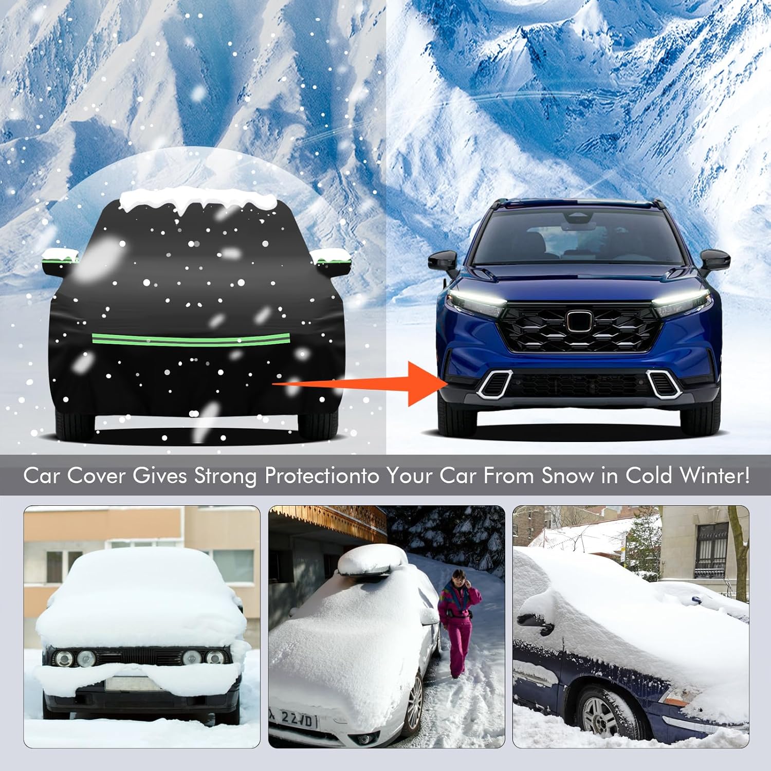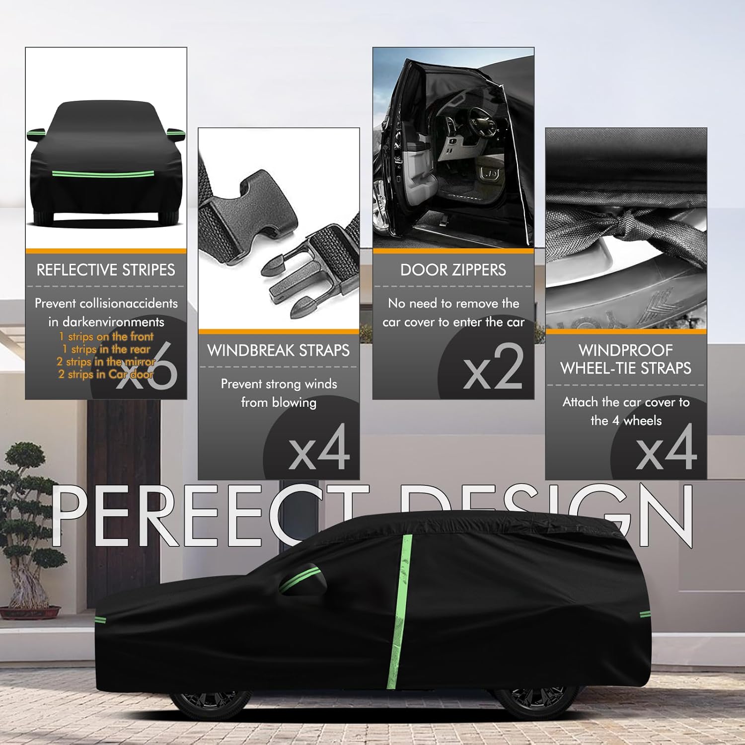 - 🚘【Safety and Humanization】①The car protection cover has 2 zippers on the front door sides to facilitate temporary access to items; ②The 4 reflective strips are located at the front, rear and the two side mirrors of the car to prevent nighttime collisions and other accidents; ③Custom fit shape with 2 mirror pockets for all-around protection.