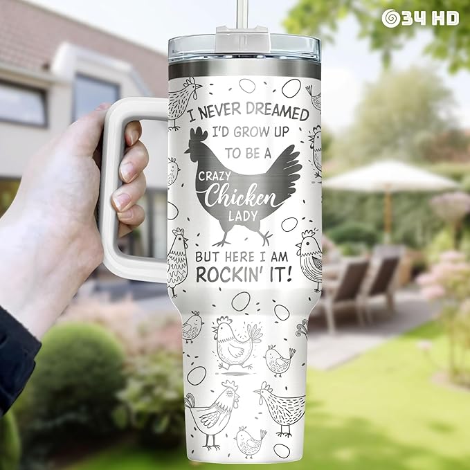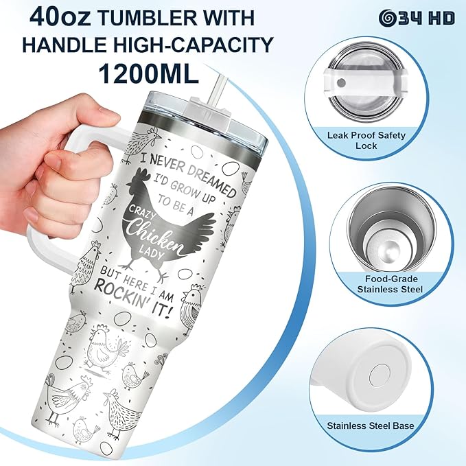 34HD Crazy Chicken Lady Tumbler with Handle and Straw, 40oz Engraved Mama Hen Coffee Mug with Lid, Funny Chicken Gifts for Girls Women on Birthday Mothers Day Christmas
