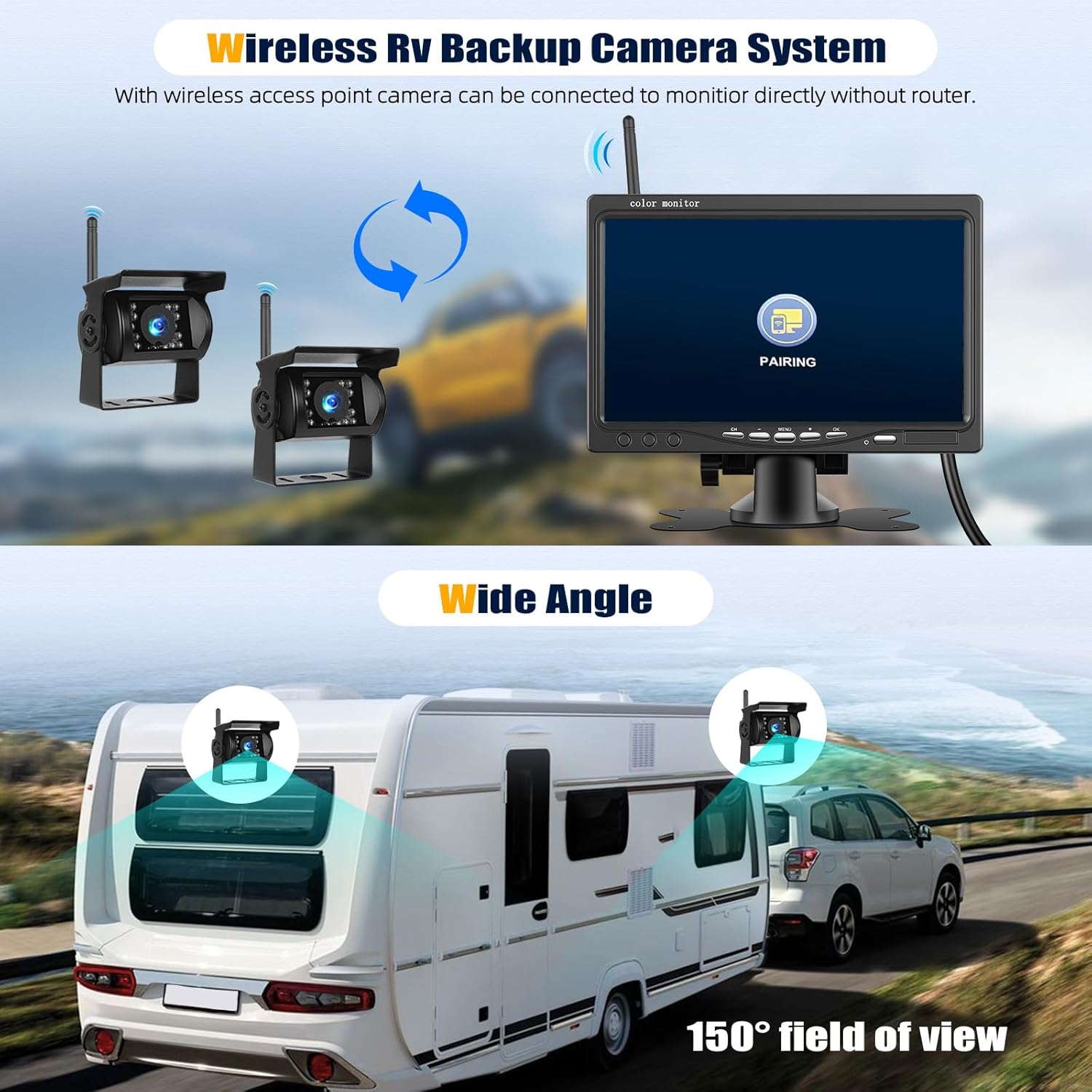 - 【Wireless RV Backup Camera】 : The wireless camera with the latest technology transmits video images through digital wireless signals, which is clearer than other wireless cameras and has strong anti-interference. Compared with previous products, the performance is improved by 50%. Whether you're navigating through tight spaces, reversing into a parking spot, or changing lanes, RV camera system has got you covered. Experience the ultimate in RV safety and convenience