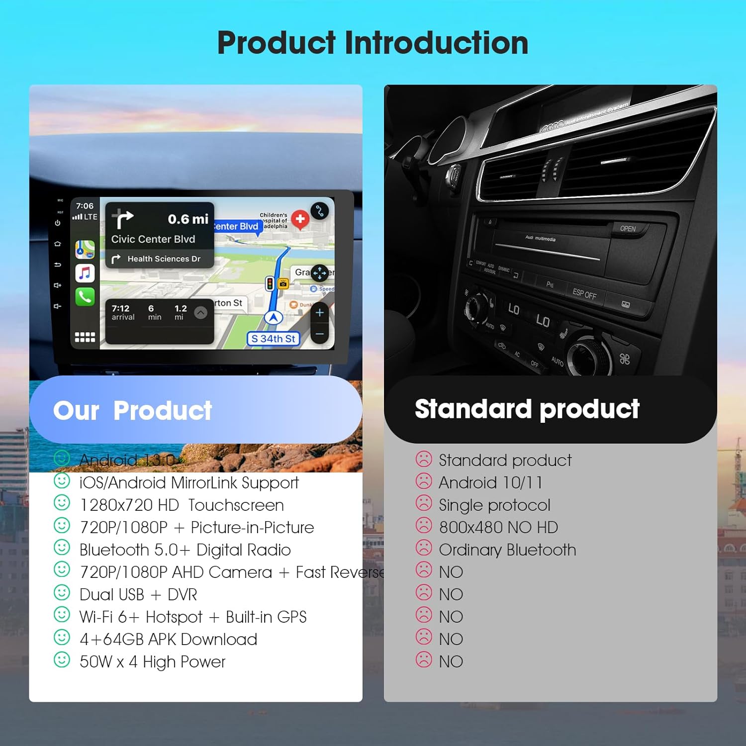 - 【Powerful 50W x 4 Output & GPS Precision】Delivers robust sound for CarPlay entertainment, while built-in GPS and network hotspot support ensure accurate, real-time navigation overlays and traffic updates.Stay connected with Bluetooth 5.0 for hands-free calls, music sharing, and internet tethering,
