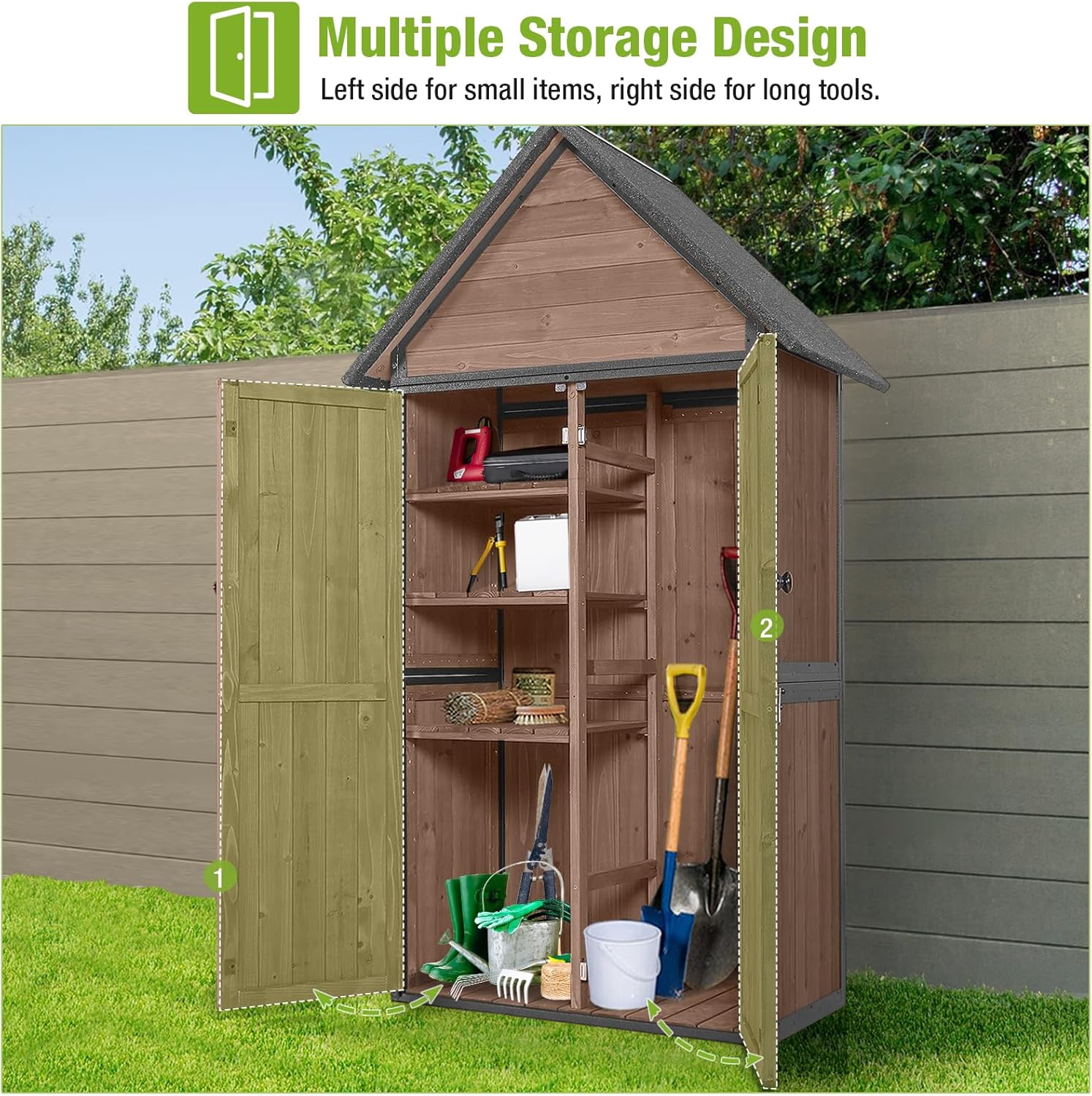 - Adjustable Shelves: Garden shed with three layers of adjustable shelves accommodate tools of all sizes, offering flexibility in organization