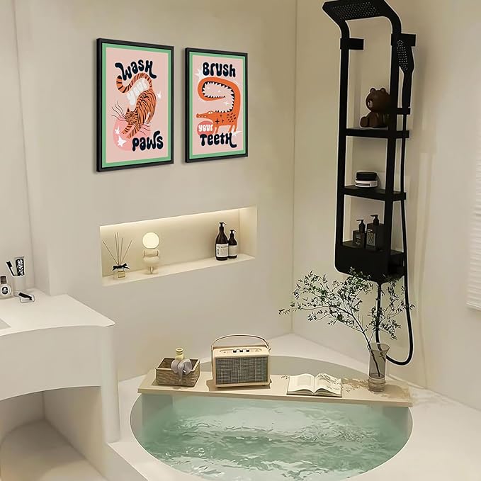 - Funny Bathroom Wall Art:This set of 2 features a tiger with Wash Your Paws and a crocodile with Wash Your Teeth, adding funky maximalist charm and humor to kids or teen bathroom decor with colorful animal bathroom prints