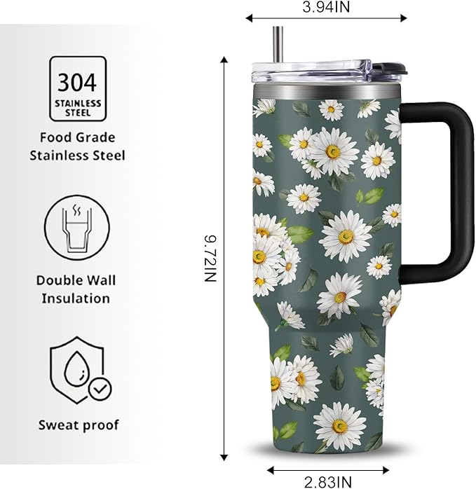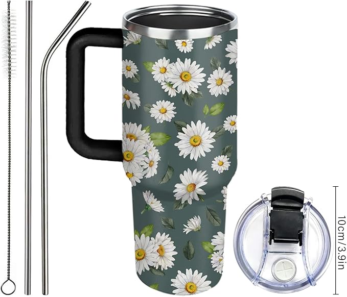 White Daisies Tumbler with Handlea 40oz, Daisy Aesthetic Gifts Flowers Stainless Steel Coffee Cup, Double Wall Vacuum Insulated Travel Mug, Christmas Birthday Gifts for Women Friend Sister Her
