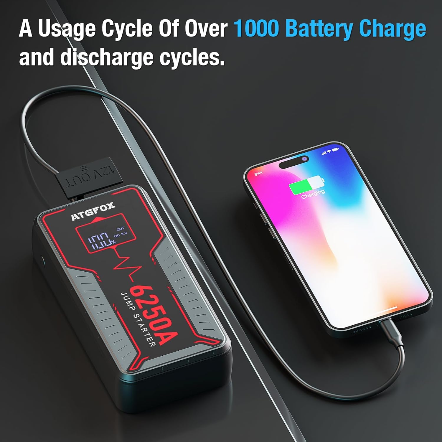 6250A Jump Starter Portable with Smart Clamp, ATGFOX 12V UltraSafe Car Battery Booster Pack for Trucks, up to 8.5L Gas/6.0L Diesel, Jump Box, 16000mAh Power Bank & Jumper Cables, Quick Charge