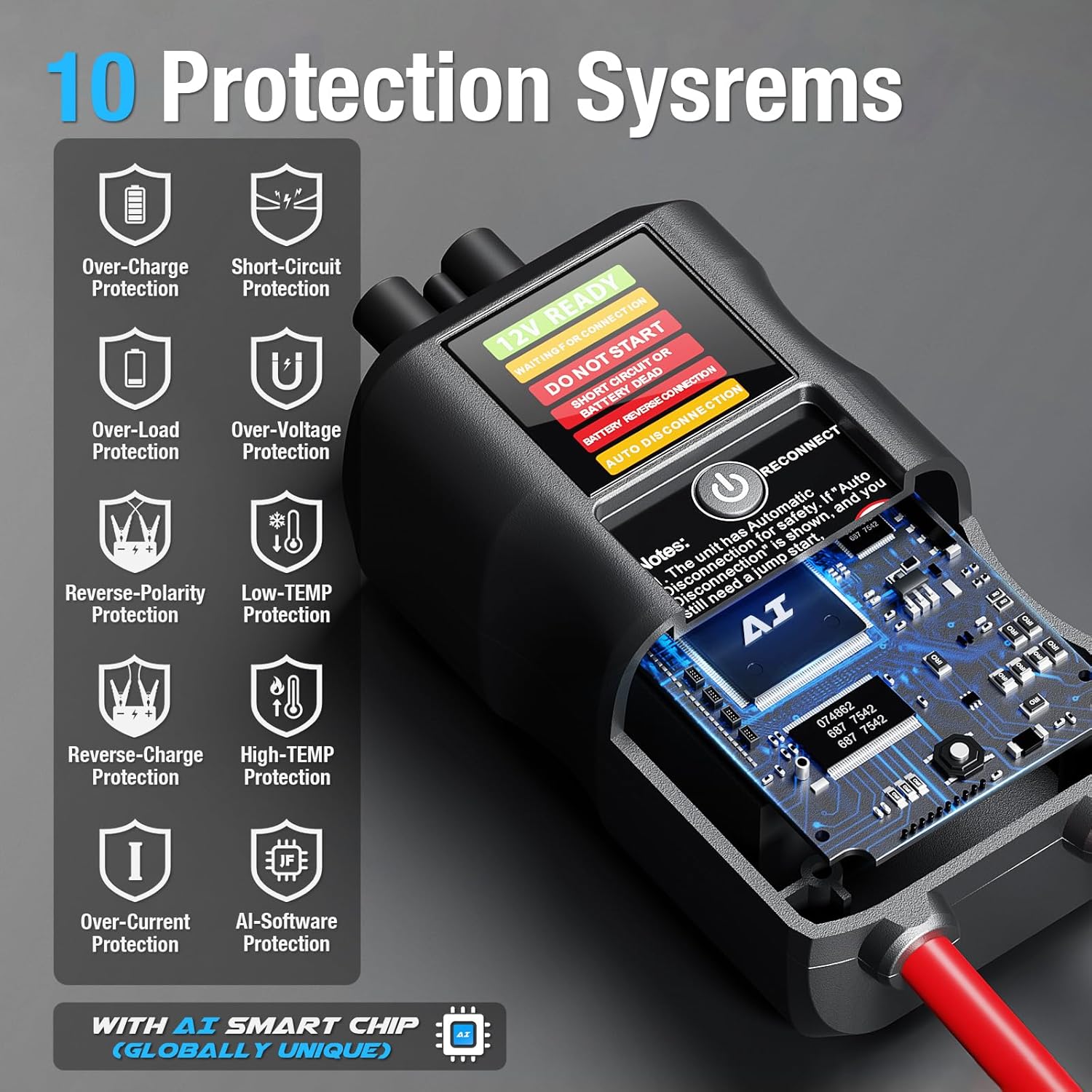 - 【INTELLIGENT SAFETY YOU CAN TRUST】 — This battery jumper starter portable features an integrated battery and smart clamp design, armed with 10 layers of intelligent protection. It guards against short circuits, reverse polarity, sparks, overheating, and more, ensuring safe operation for both you and your vehicle. Enhanced thermal efficiency and power management extend the jump box’s lifespan, preventing damage from loose connections or battery issues.