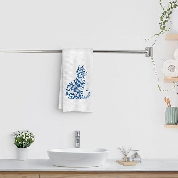 Blue Floral Cat Kitchen Towels, Cat Lovers Mom Lady Gifts Hand Towels for Bathroom, Kitty Kitten Dish Tea Towels for Kitchen Decor, 16x24 Inch
