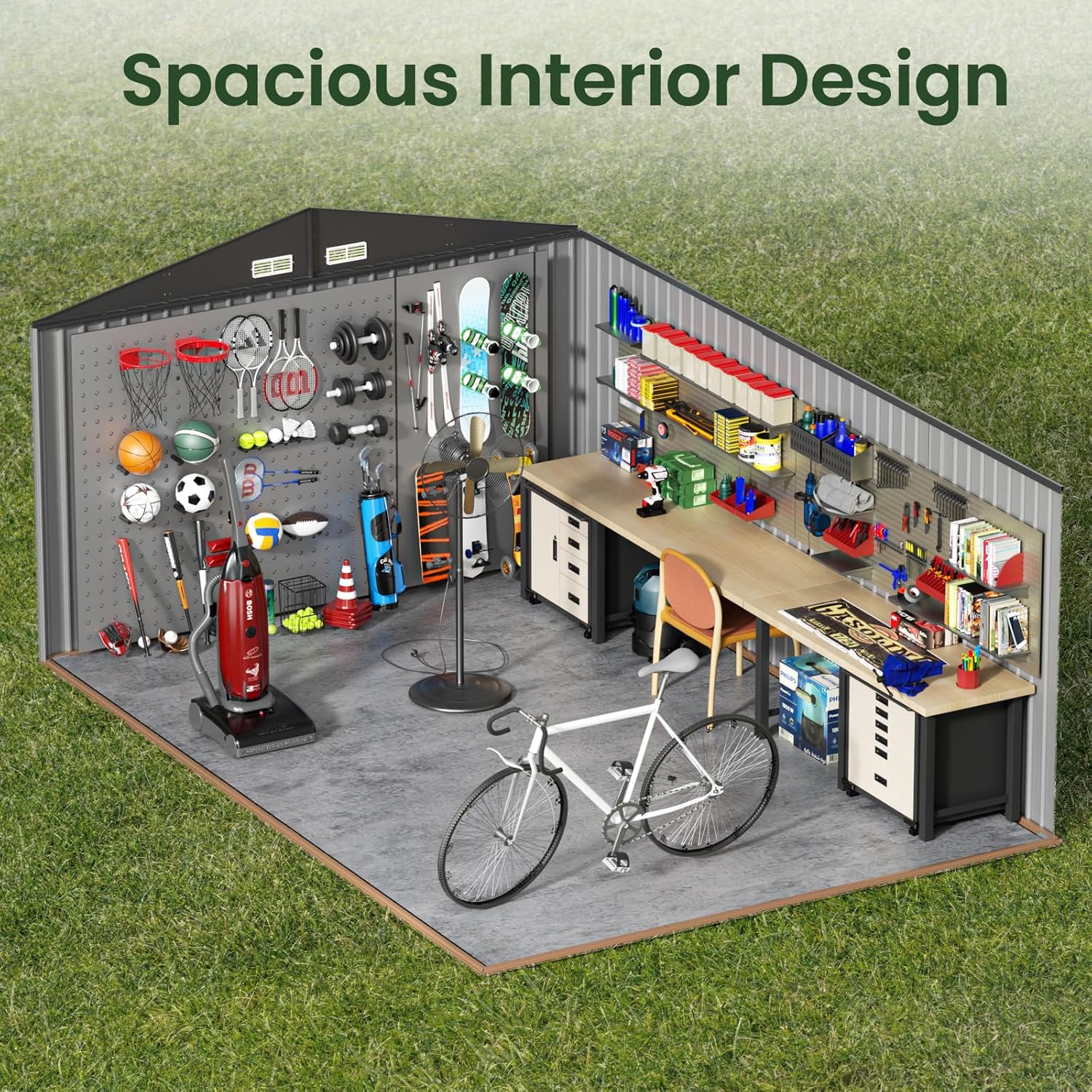 GVDV 10x14 FT Outdoor Metal Storage Shed, Durable Garden Shed with Updated Frame Structure for Backyard, Patio, Tool Storage, All-Weather Shelter for Bike, Gardening Tools, Lawn Mowers