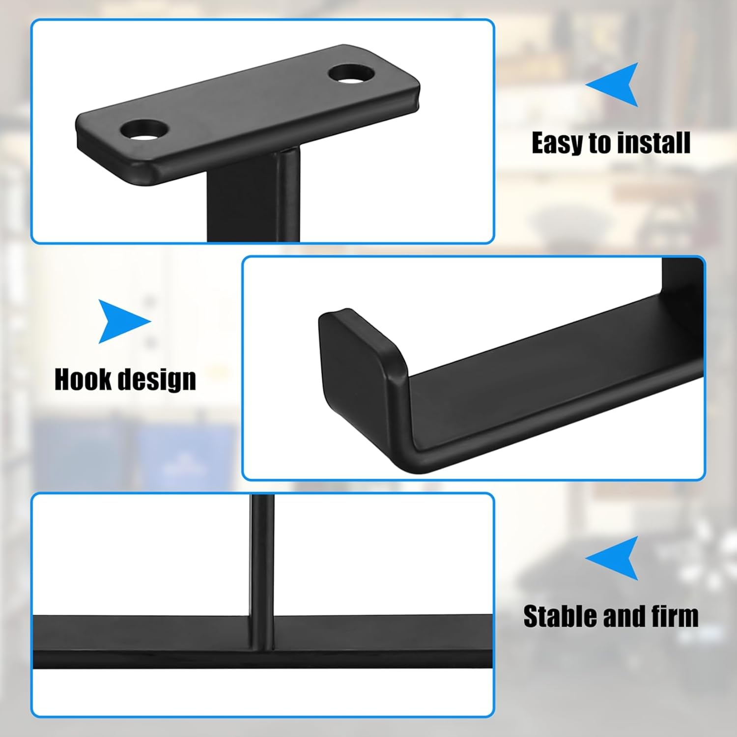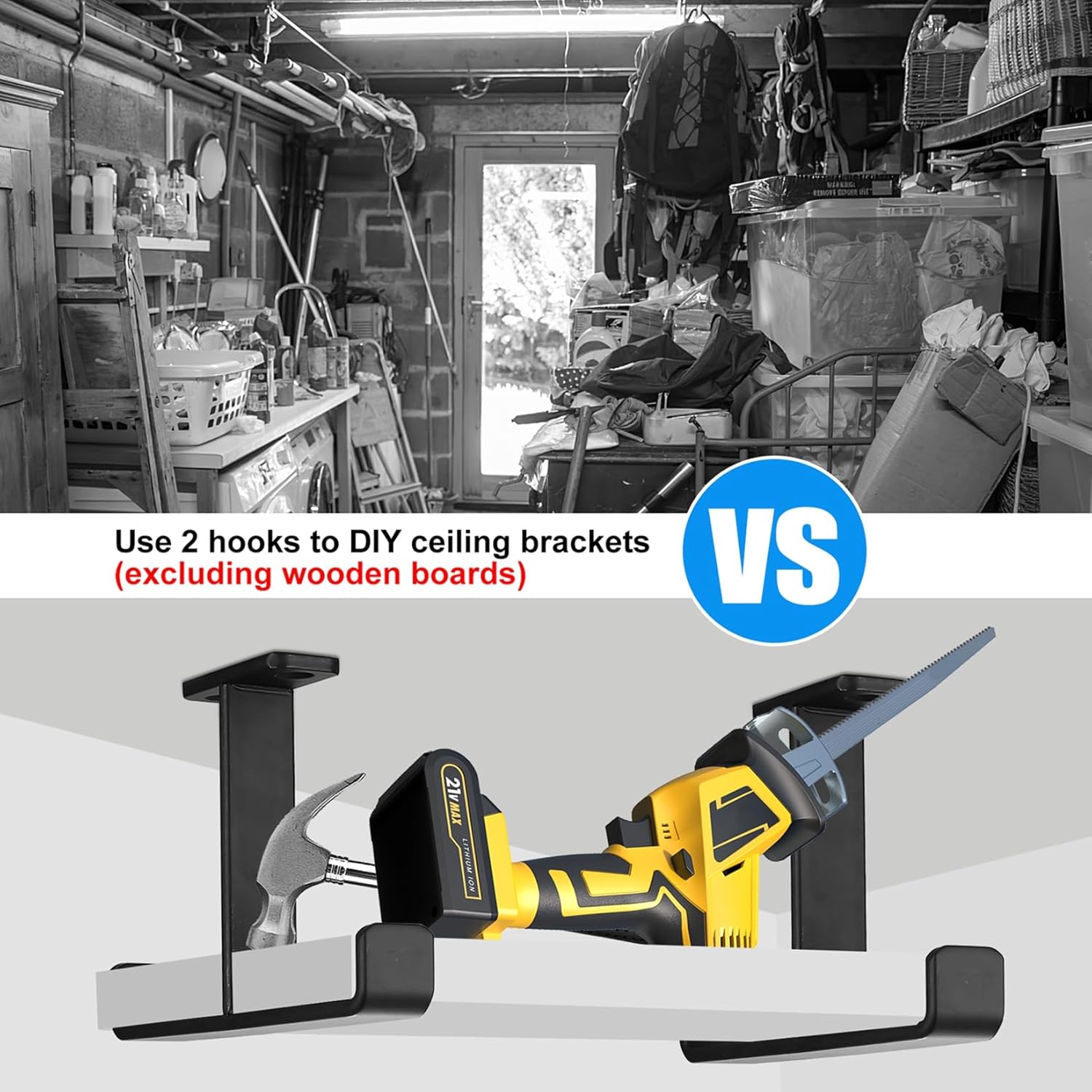 - Double Arm design: Both arms of heavy duty garage hooks can be used to hang items. Use multiple overhead garage ladder hooks in combination to hang more/heavier/larger items, helping you free up space in your shed or garage. The rounded surface and edges ensure safe use and items will not fall off easily.