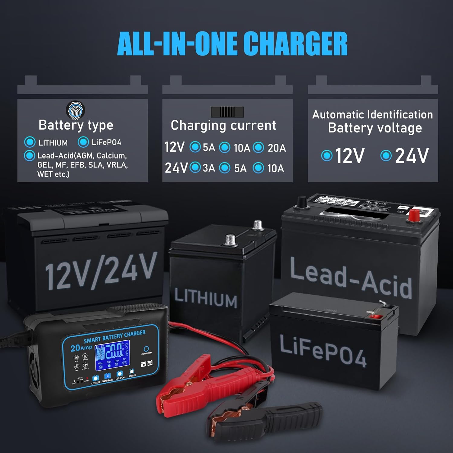 - Wide Application--Our 12V 20A/24V 10A smart car battery charger can charge all Lead-Acid(AGM, Gel, SLA, Flooded, VRLA, EFB, MF, WET, ect.), Lithium, and LiFePo4 batteries, meaning that it can used for car, truck, boat, motorcycle, RVs, SUVs, ATVs, lawn mower, golf carts, tricycles, agricultural vehicles, etc. It can recognize 12V/24V battery automatically. Max: Lithium :12.4V-14.6 / 24.8V-29.2V. Lead Acid :14.7V/29.4V. LiFePO4: 14.6V/29.2V.