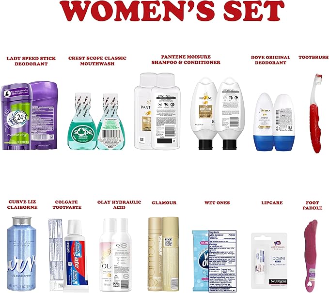 Womens Travel Toiletry Kit, 13 Travel-Size Hygiene Essentials for Bath, Shaving, Personal Care in TSA-Compliant Transparent Bag, Mini Toiletries Kit for Business, Charity, Gift for Her