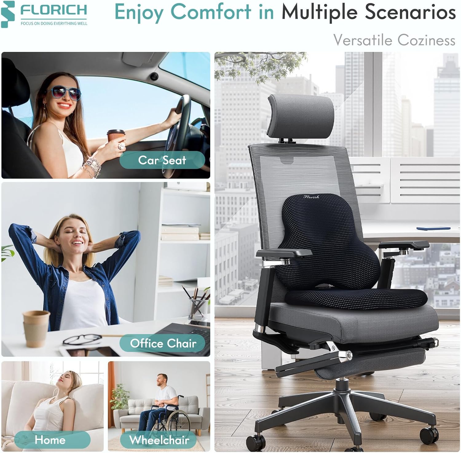 - Enjoy Comfort in Multiple Scenarios: Florich seat cushion and lumbar support pillow set makes for a memorable and healthy gift for Christmas, New Year's, Mother's Day, Father's Day, Valentine's Day, birthdays, weddings, and graduations. Suitable for people of all ages and lifestyles, it is not only ideal for office chairs, home chairs, car seats, gaming chairs, airplane seats, wheelchairs, etc., but also for office workers, drivers, teachers, students, and those who enjoy reading and gaming.