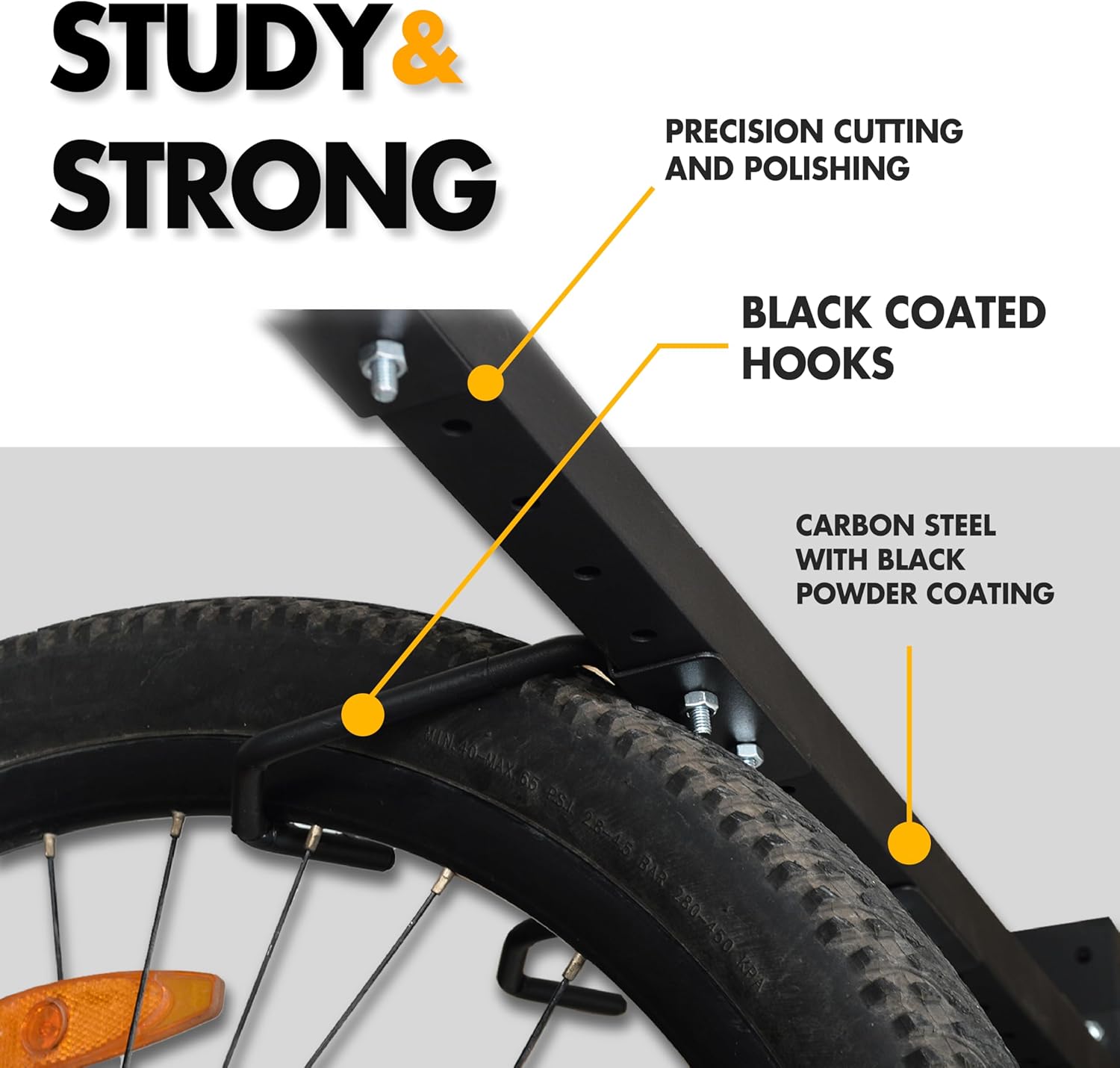 - SMART DESIGN: Optimal bike organization. Each hook is secured in place with a locking pin for easy tool-free adjustment. With tire support bars, your walls will not be scratched. Height can be adjusted from 20" to 76" to fit all bike sizes.