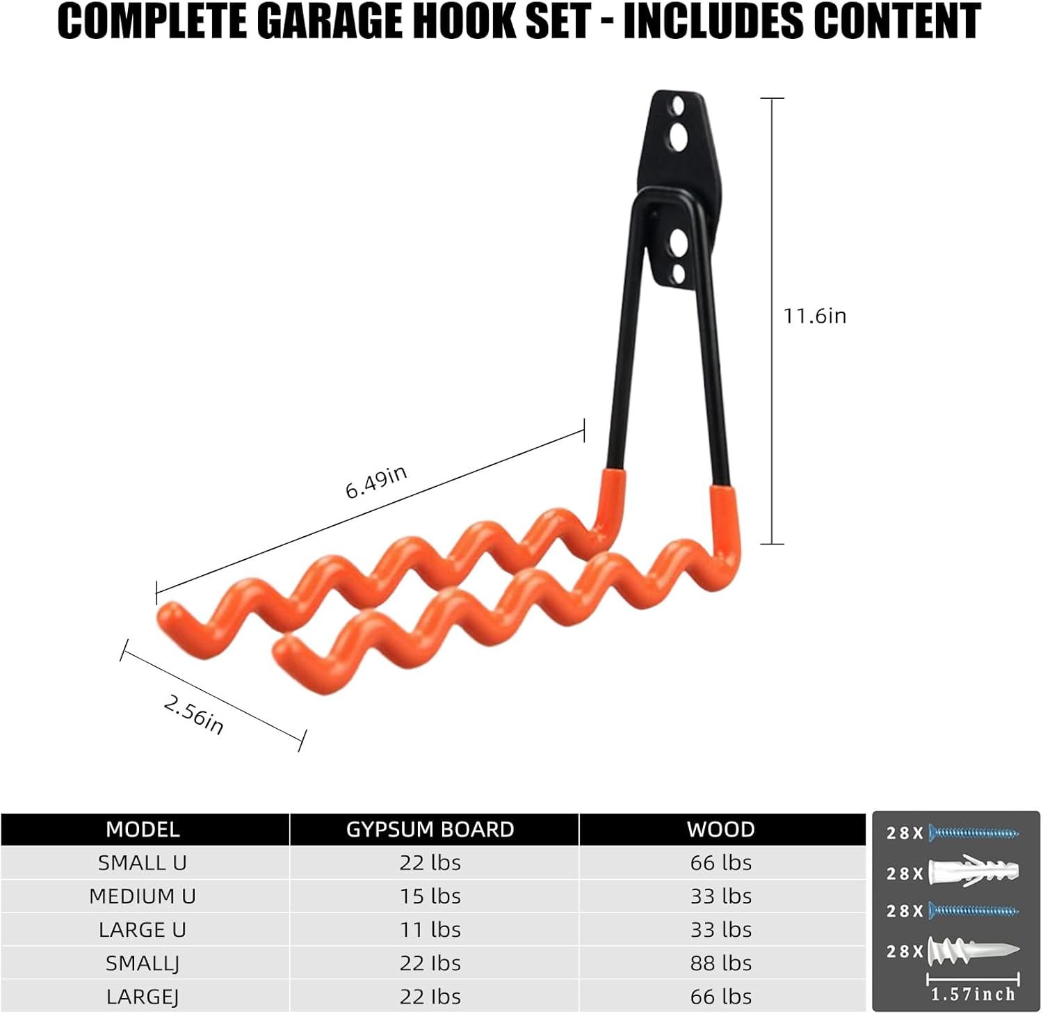 - SET CONTENTS AND USAGE: The set includes 4 orange wave hooks, measuring 11.6x6.49x2.56 inches, ideal for hanging bulky and heavy items like ladders, bicycles, etc. The garage wall organizer black anti-rust coating enhances visibility in low-light environments