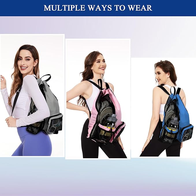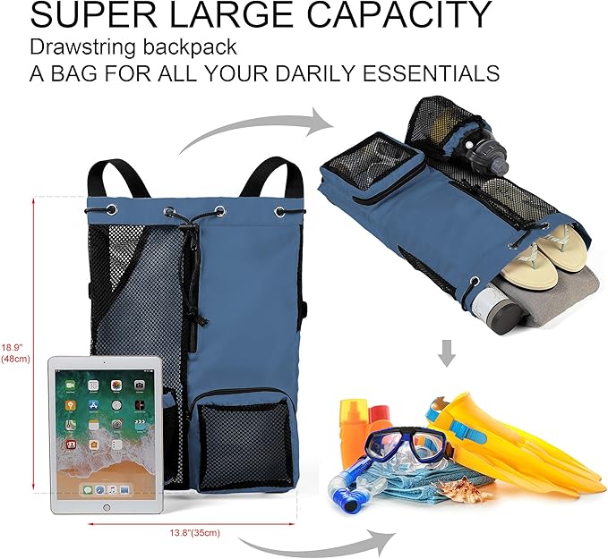 - 🌊ADJUSTABLE STRAP & LARGE CAPACITY -- Our swim bags for swimmers have adjustable shoulder straps that can be adjusted to fit your different needs. Moreover, the backpack design is more convenient, so that your shoulders are more comfortable. This mesh gym backpack measures 18.9 * 13.7 inches and is made of High-Density Oxford, can hold towels, clothes, workout gear, gym gear, swimming gear, sports gear, beach items, and more