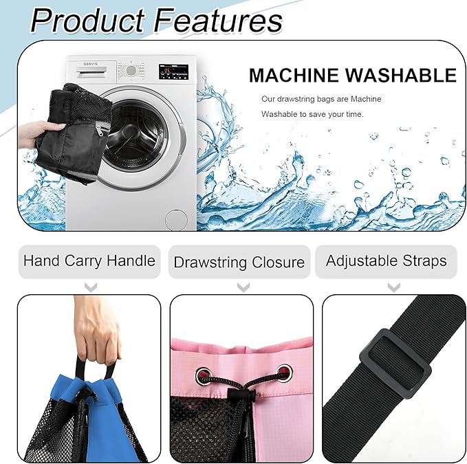 - 🌊MULTI-FUNCTIONAL -- Our sports backpacks are suitable for many occasions, such as gym, sports, swimming, beach, basketball, football, travel, sports, etc. The drawstring gym bag is perfect as a gym bag, swim bag, pool bag, basketball bag, soccer bag, or beach gear bag. This draw string back bag also makes a good workout gifts for swimmers, men and women. There is also a handle to hang the beach backpack on the hook for easy storage.
