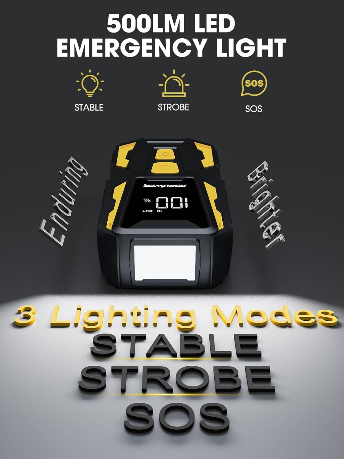 - 3 Modes LED Flashlight - The battery jumper starter is integrated with an LED flashlight with 3 light modes, including Flash Light, Strobe Light, and SOS Light. This multi-purpose flashlight provides light as bright as 500 lumens, which is very handy in case of an emergency and outdoor adventures, especially in poor lighting conditions.
