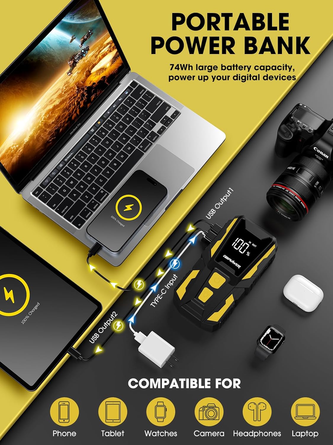 - 74Wh Backup Power Pack - Z07 car battery starter has a large lithium battery capacity to 74Wh at 3.7V, and it is designed with 2 USB outputs (5V/3A)and (5V/2.1A) that can be used as a backup power bank to charge your cellphones, tablets, and other mobile devices at high charging speed( 50% faster than a standard charger). The input charging port has been updated to the type-C port as well.