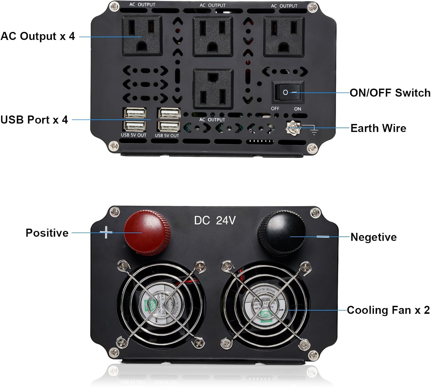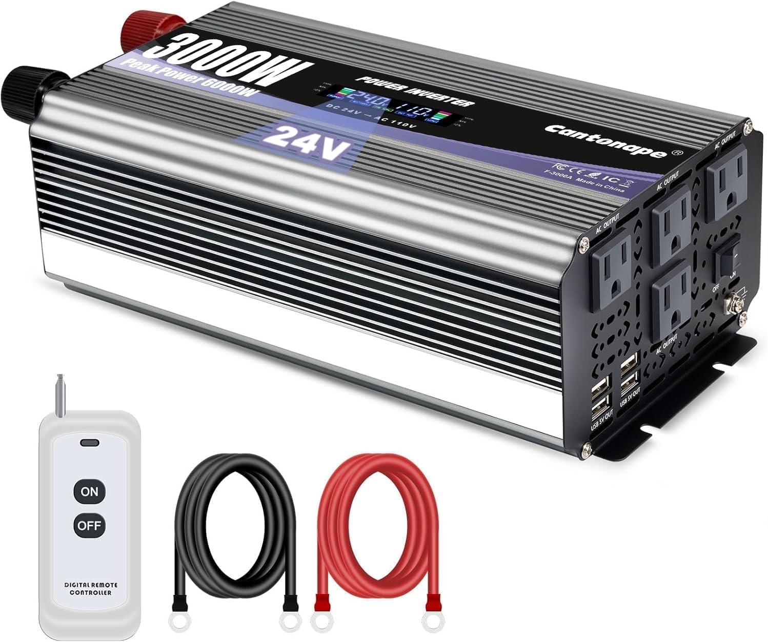 - Powerful Performance: Converts DC 24V to AC 110V/120V with a continuous output of 3000 watts, peaking at 6000W. Equipped with 4 AC output interfaces, 4 USB Ports and earth wire.