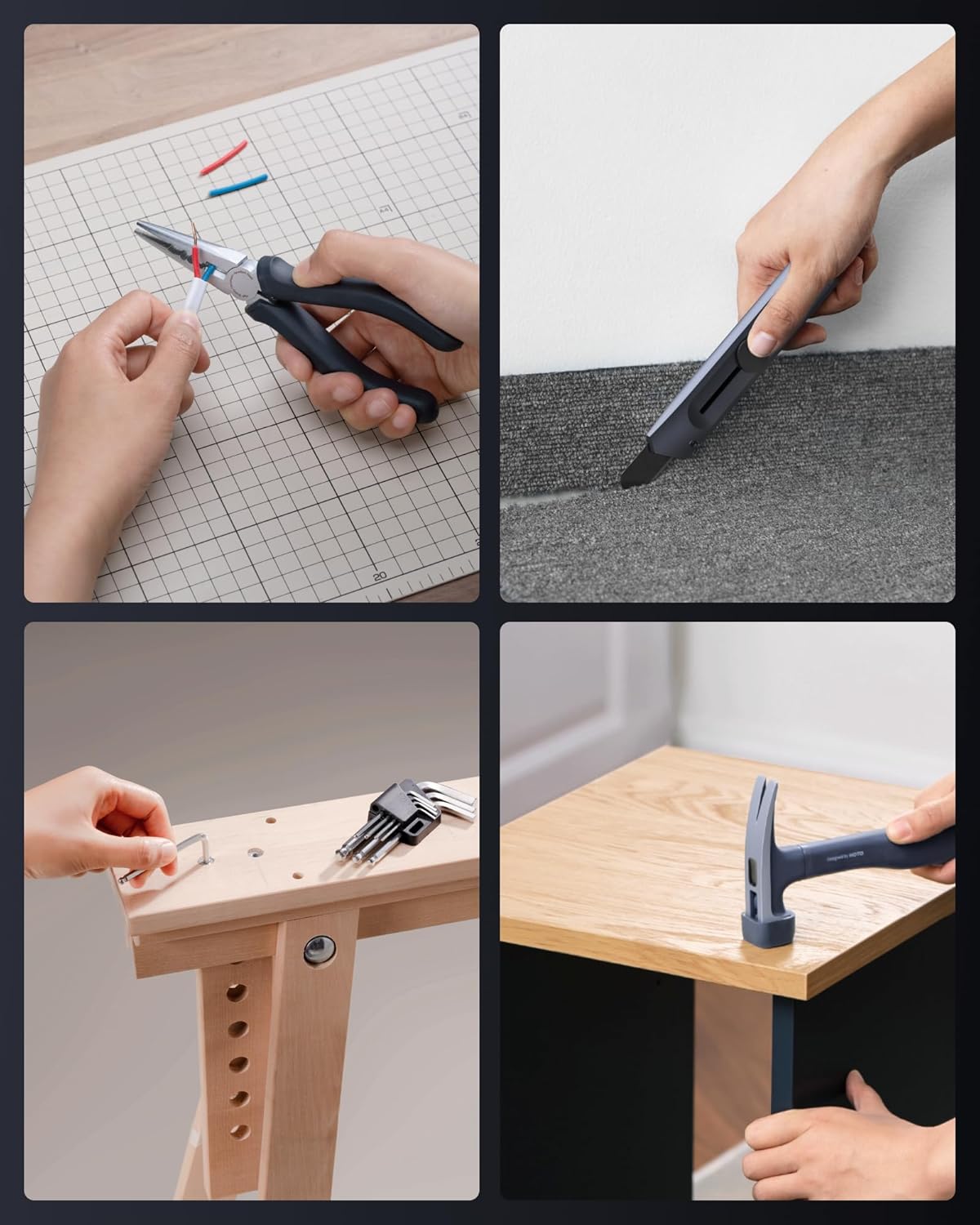 - Ergonomic Design: Non-slip soft-grip handles reduce fatigue. Safety upgrades: self-locking tape measure; shock-absorbing rubber hammer cover; 25° ball-end hex keys for angled access, and safety blade lock utility knife. Confidence in every grip