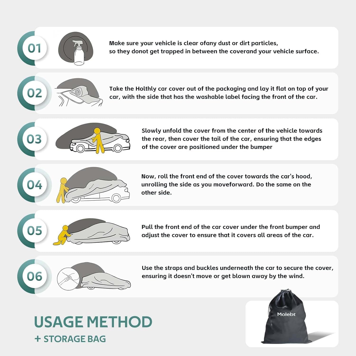 - 【HIGH-QUALITY MATERIAL】:Molebt car cover is made of high density polyester, More wear-resistant and tear-resistant. 1800mm water pressure keeps the cover 100% waterproof. Light weight is easy to put on and take off.